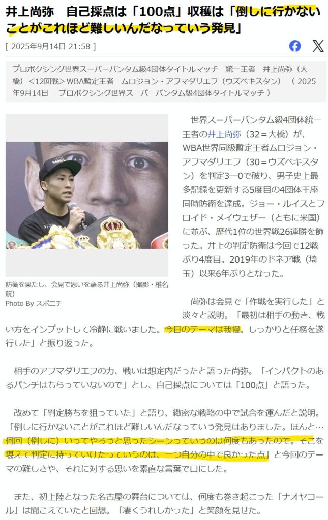 引用元:【記事全文】井上尚弥 自己採点は「100点」収穫は「倒しに行かないことがこれほど難しいんだなっていう発見」 – スポニチ Sponichi Annex 格闘技